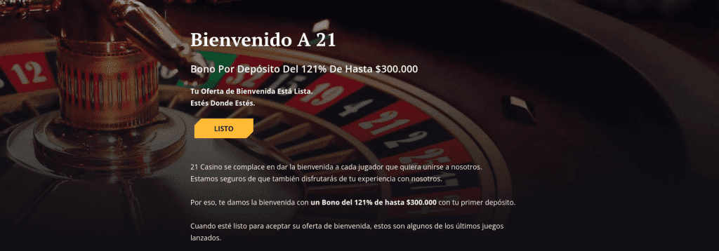 Reflectiendo sobre los incentivos ofrecidos por 21 Casino, el bono de bienvenida se destaca con un atractivo 121% sobre el primer depósito hasta un máximo de $300.000 CLP, condicionado a apuestas de 35 veces el monto recibido. Es fundamental que los jugadores nuevos entiendan que este bono tiene una validez de 30 días a partir del depósito inicial y ciertas restricciones de métodos de pago.