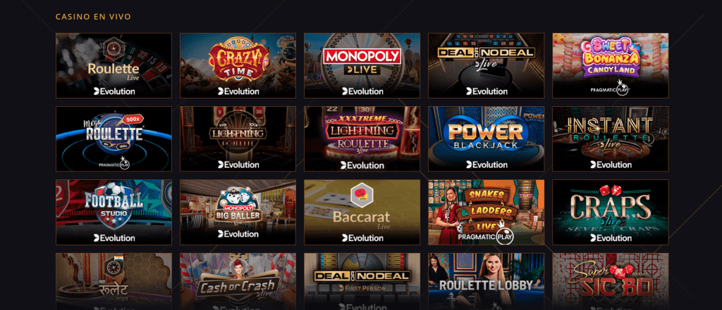 La sección de juegos con crupier en vivo es impresionante, con más de 50 opciones disponibles. Estos juegos ofrecen la emoción del casino en tiempo real, incluyendo: