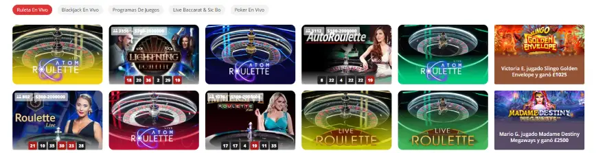 Al entrar en la sección de juegos de casino en vivo de Magic Red, los jugadores encontrarán una gran variedad de opciones de crupier en vivo de alta calidad. Aunque la oferta de juegos en vivo del casino es algo menor que los 180 títulos en vivo de Betway Chile, Magic Red sigue ofreciendo una experiencia de casino en vivo de primera categoría. Algunos de los juegos en vivo más destacados disponibles son: