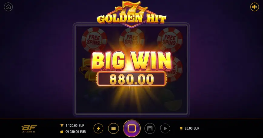 Aunque el proveedor no especifica todos los valores de apuesta en su ficha oficial, al probar la versión demo y revisar los estándares de BF Games, puedo confirmar que 777 Golden Hit se adapta bien a presupuestos modestos. Datos generales sobre el rango de apuesta: