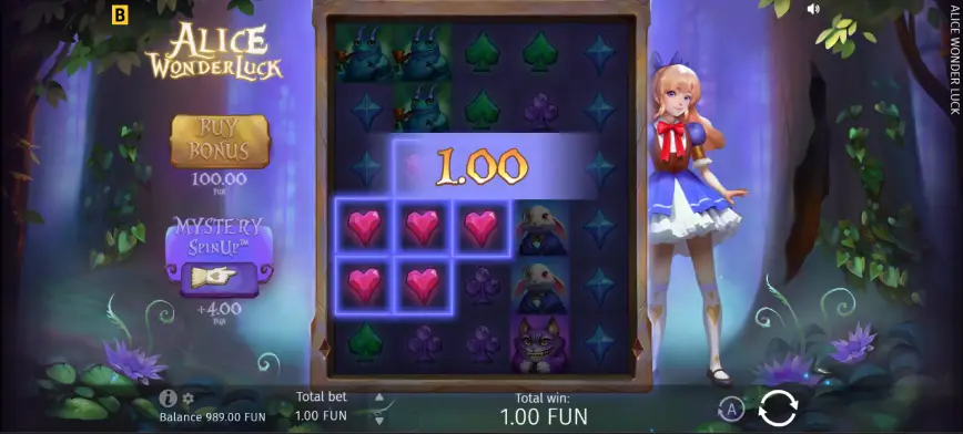 Alice WonderLuck ofrece una variedad de opciones de apuesta, haciendo que el juego sea accesible para todo tipo de jugadores. Ya sea que prefieras apuestas modestas o grandes inversiones, esta tragamonedas te permite ajustar tu estrategia para maximizar tu disfrute y potencial de ganancias. Estas opciones flexibles aseguran que tanto los jugadores casuales como los de alto riesgo puedan participar sin sentirse limitados por restricciones de apuesta.