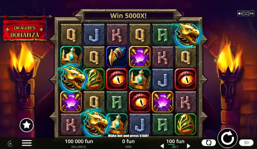 Una de las características destacadas de Dragon’s Bonanza es su tablero de juego de 5×6, que es más grande que el formato tradicional, ofreciendo más oportunidades para formar combinaciones ganadoras. El juego utiliza el principio de cascada, donde los símbolos ganadores desaparecen y son reemplazados por nuevos símbolos que caen desde arriba. Este mecanismo no solo aumenta la emoción del juego, sino que también permite múltiples victorias en un solo giro, ya que las cascadas continúan mientras se formen nuevas combinaciones ganadoras.