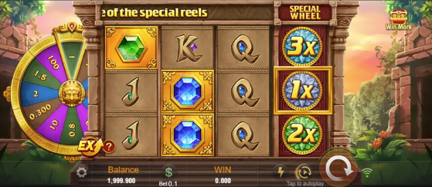 El diseño temático de Fortune Gems 2 es uno de sus mayores atractivos. Los carretes del juego están colocados entre columnas de piedra talladas artísticamente, evocando una atmósfera de antigua civilización. Los símbolos incluyen zafiros, esmeraldas, rubíes y un imponente pájaro de oro incrustado con gemas, que recuerda a las formas artísticas tradicionales de Camboya.
