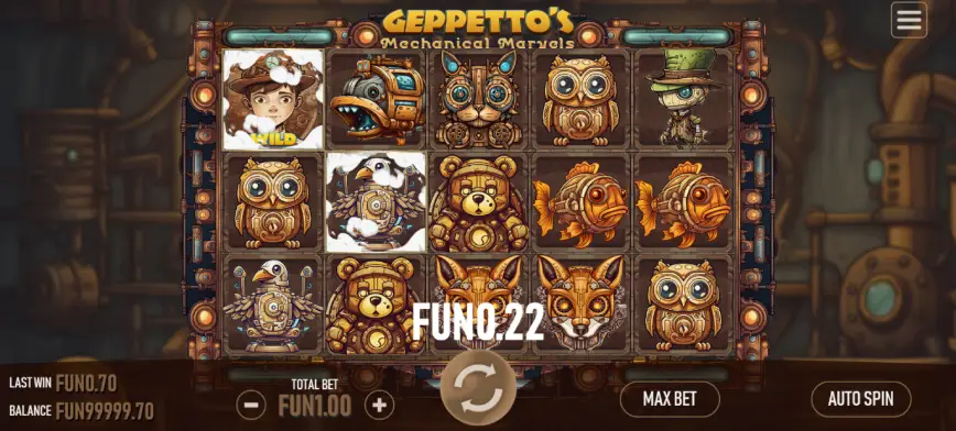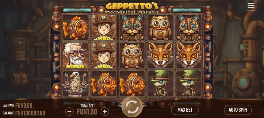 Geppetto’s Mechanical Marvels utiliza un formato clásico de cinco carretes, que es familiar para muchos jugadores de tragamonedas. Este diseño no solo es intuitivo, sino que también permite una amplia variedad de combinaciones ganadoras y características de bonificación. El juego es sencillo y directo, lo que lo hace accesible a la mayoría de los jugadores.