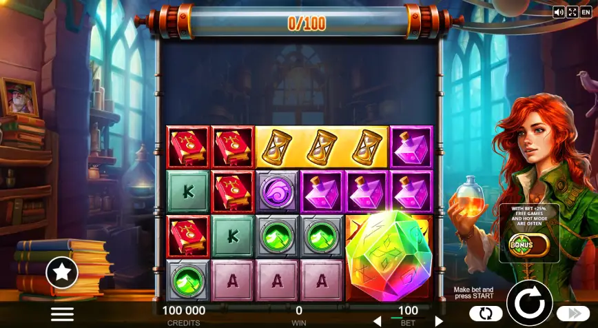 El Frasco Mágico es fundamental en esta aventura alquímica. Durante el juego base, el Medidor de Energía se llena gradualmente a medida que los jugadores logran victorias. A medida que el medidor se llena, también se acumula energía a través de símbolos gigantes, bloques de oro y símbolos Scatter. Una vez lleno, el frasco activa los Juegos Gratis en el modo “Hot”, brindando aún más oportunidades para obtener grandes recompensas y experimentar la magia del juego.