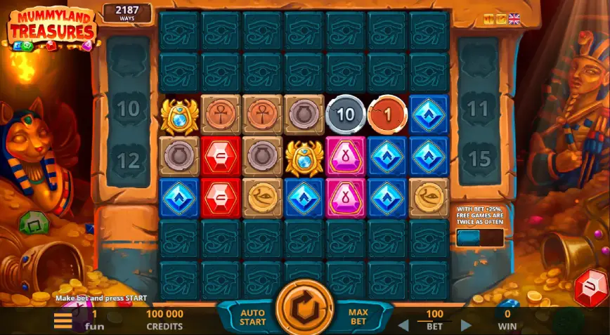 La disposición del campo de juego en Mummyland Treasures es inusual y emocionante, con dimensiones de 7×7 que ofrecen una amplia variedad de posibilidades para formar combinaciones ganadoras. Inicialmente, solo están activas tres filas en el centro del campo, mientras que las filas superiores e inferiores están cubiertas con bloques de piedra. Este diseño crea un total de 2187 formas de ganar, y los jugadores deben formar combinaciones de 3 a 7 símbolos idénticos en posiciones adyacentes, comenzando desde el lado izquierdo del campo. A medida que se desbloquean las filas adicionales, el número de formas de ganar puede aumentar dramáticamente, hasta alcanzar 823,543, proporcionando así un potencial significativo para grandes ganancias.