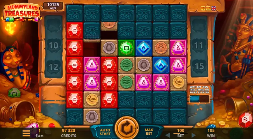 Una de las características más emocionantes de Mummyland Treasures es su mecánica de ganancias en cascada. Cuando se forma una combinación ganadora, los símbolos involucrados explotan y desaparecen, permitiendo que nuevos símbolos caigan en las posiciones vacías. Además, los bloques de piedra adyacentes también se eliminan, incrementando las posibilidades de generar más combinaciones ganadoras. Este ciclo de cascadas continúa hasta que no se formen más conexiones ganadoras, manteniendo la emoción y aumentando las oportunidades de obtener recompensas significativas. Esta mecánica no solo añade dinamismo al juego, sino que también ofrece a los jugadores la oportunidad de prolongar sus rachas ganadoras con cada giro.