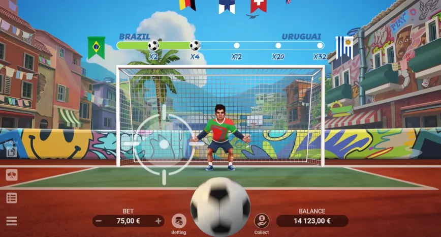 Penalty Shoot Out se juega seleccionando una de las muchas selecciones nacionales disponibles, como España, Portugal, Suecia o Francia. Luego, eliges el importe de tu apuesta, que puede variar entre 1 € y 75 €. Cada ronda consta de cinco tiros, donde puedes elegir manualmente la dirección de tu disparo o dejar que el juego lo decida aleatoriamente.