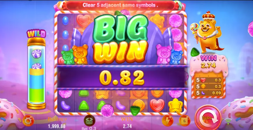 - 🎉 Candy Drop: En este juego de bonificación, los jugadores seleccionan uno de tres caramelos y entran en una especie de minijuego tipo pachinko. Cada caramelo puede otorgar diferentes multiplicadores que se añaden a la ganancia final.