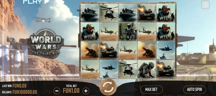 World Wars The Third War es una tragamonedas que sumerge a los jugadores en un hipotético conflicto global, desarrollada por Urgent Games y lanzada en noviembre de 2024. La narrativa del juego está diseñada para ofrecer una experiencia inmersiva, en la que los jugadores se ven envueltos en un entorno de guerra mundial ficticia, que se siente sorprendentemente realista gracias a la cuidadosa atención al detalle en su ambientación histórica.